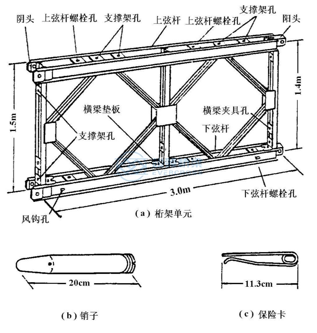 常用连接贝雷片的销有两种形状,一种为标准销,一种为无头销。根据桁架片的安装位置选择不同的销子。