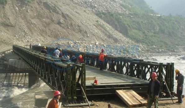 321型装配式钢桥是在原英制贝雷桁架桥的基础上结合我国国情和实际情况由交通部公路规划设计院设计的快速组装桥梁,是一种可分解的、能快速架设的制式桥梁,全桥采用高强钢全焊制成,主梁为可分解的轻型桁架,桁架间用单销连接,构件互换性强,重量较轻,运输拆装方便,还可根据跨径和通载要求组装成各型装配式钢桥,是一种被广泛应用的较为完善的应急交通保障组合装配式钢桥。由于其桥面板钢材较薄,横梁尺寸较轻,一般适用于荷载较小的情况。